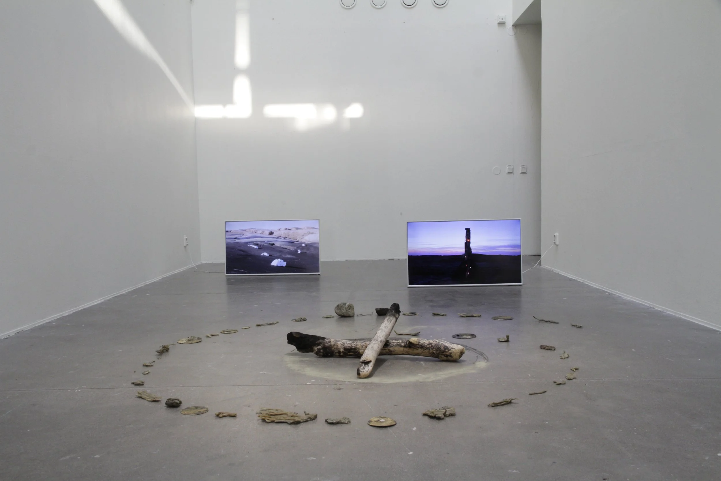 This artwork consists of four songs about love, written on the island of Hållö. They are presented through a video displayed on two screens. The video serves as documentation of a sculptural process carried out on Hållö. The sculptures are fragments from a previous work, which were relocated to the island. Some fragments were left on Hållö, while others were altered and presented in the gallery. These fragments were later melted down and transformed into death masks.
